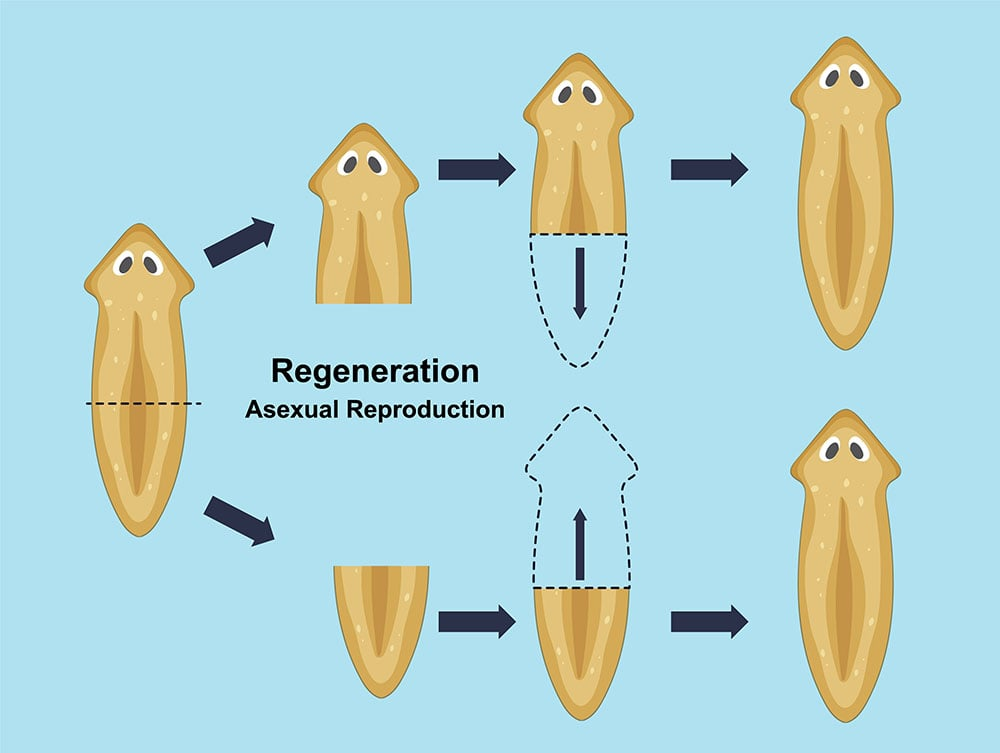 He did fascinating experiments with planaria: flatworms that can regenerate. If you split a planaria in half, they re-grow into two individuals in a matter of days. Even if you cut one into twenty (!) pieces, you get twenty new clone worms. The genes, of course, don’t change. So what’s telling the cells at the wound site what to grow (e.g., a head and not a tail)?
